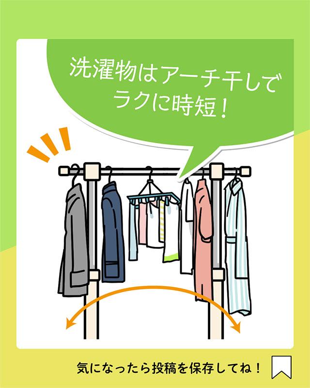 中央に長い衣類、両端に短い衣類を干す「アーチ型」にすることで、空気の流れが生まれ、乾きやすくなります。